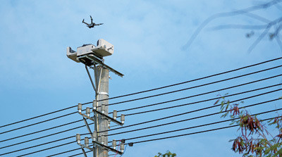 南方电网广西电网公司在涠洲岛打造全区首个“电力智能巡检+智慧政务+智行文旅”应用场景。图为无人机自动返回无线充电机巢充电。 马华斌/摄